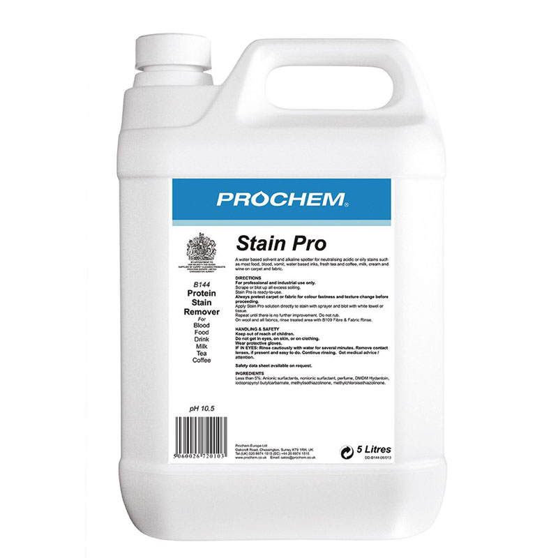 Heavy duty water and solvent based alkaline protein spotter for blood, vomit, wine, ink, fresh tea and coffee and most food based stains.