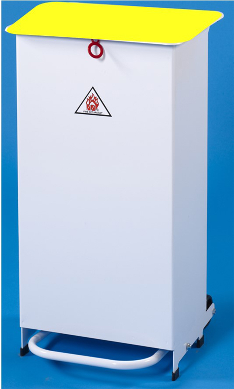 Suitable for medical or hazardous waste, made from fire-retardant , corrosion resistant materials. Hands-free lid, foot operated. Pull out handle and wheels for easy movement. Bungee bag holder.